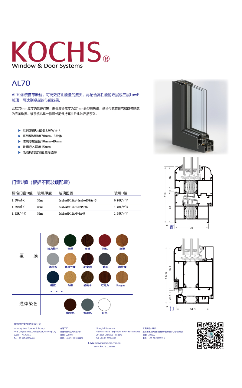 AL70系统自带断桥,可高效防止能量的流失。再配合高性能的双层或三层LowE玻璃,可达到卓越的节能效果